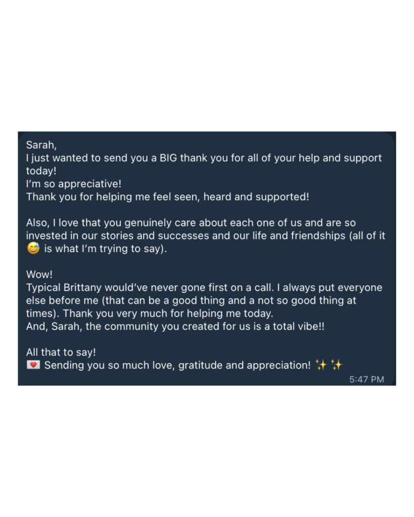 Life happens, and this container is designed to grow with you. We’ve designed it with spaciousness and real life in mind. You can take breaks and come back when you’re ready. You don’t have to have all your **** together or oodles of time to keep going- you just have to stay connected. Think of it like a hybrid between coaching, therapy for business, & personal development all in one. This space IS the vehicle to get you from A to Z and out of the messy middle.