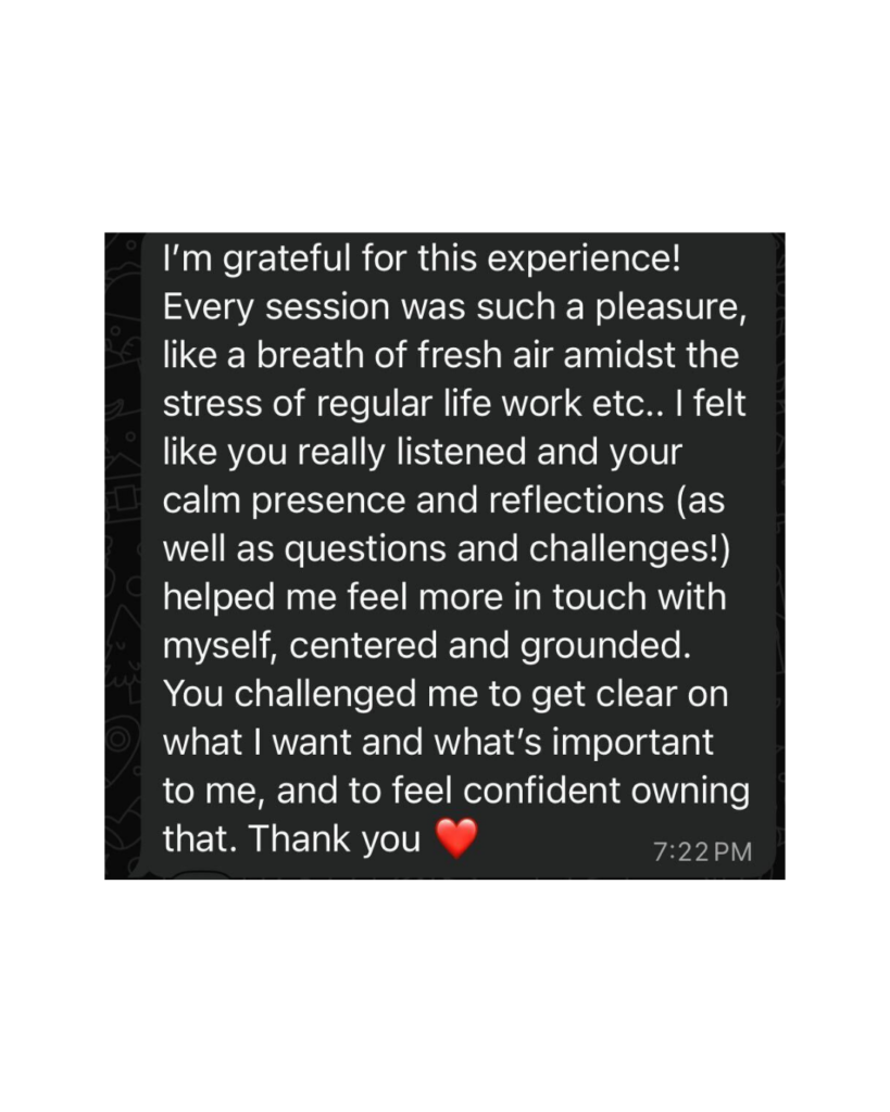 Imagine waking up every day excited, fulfilled, and doing what you love. As your coach, I’ll be with you every step of the way as you navigate career & life transitions with confidence and clarity.
